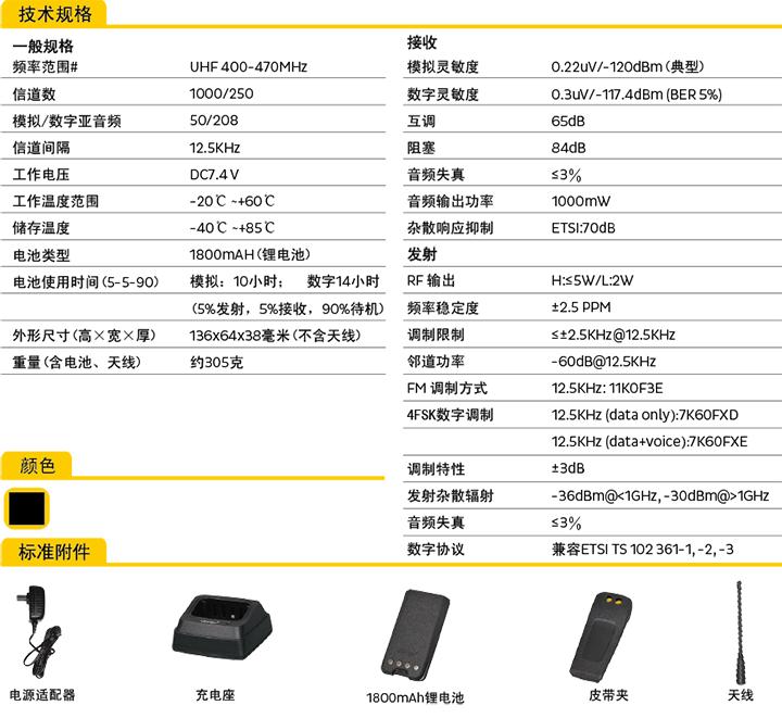 数字对讲机 1000信道、1000个联系人地址簿 LCD全点阵显示屏及多功能数字键盘 数字、模拟双模式兼容 IP56防尘防水保护 短信编辑、查看与发送 主被叫检测、呼叫提示 16位密钥语音加密 一键通可编程侧键 选择呼叫、遥毙、 大音量、高保真音频输出